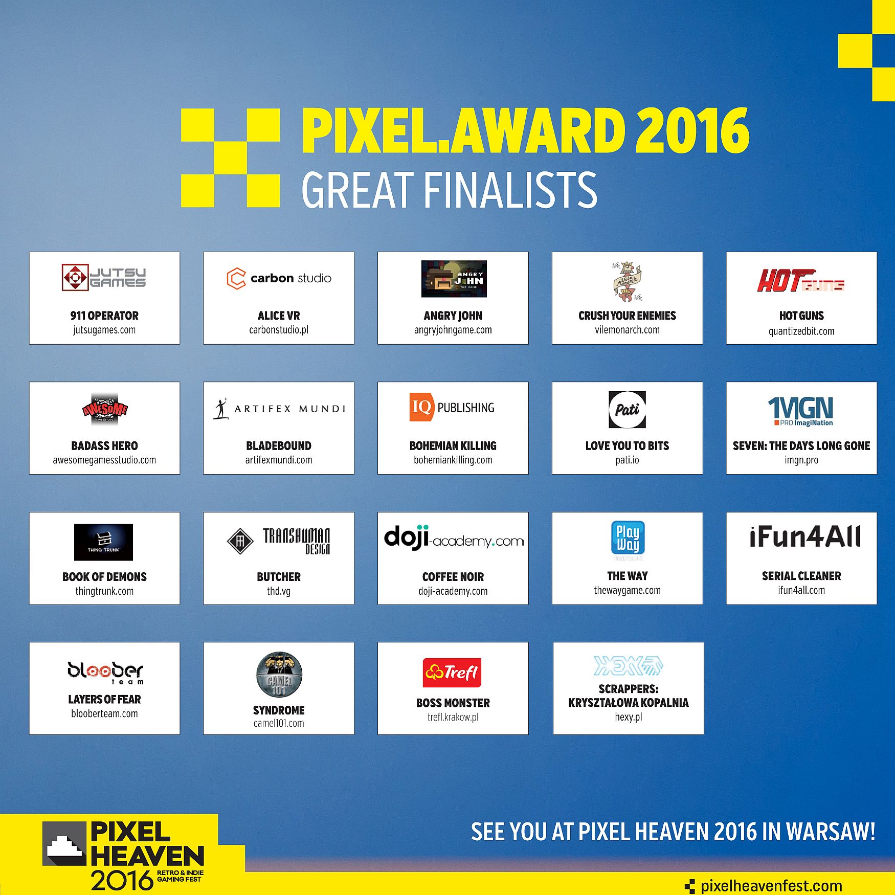 To już 4. edycja największego w Polsce międzynarodowego konkursu dla twórców gier niezależnych. Wszystko rozstrzygnie się na imprezie Pixel Heaven w dniach 3-5 czerwca 2016 r. w Warszawie. O tym, kto zdobędzie laur zwycięzcy zdecyduje jury oraz (w przypadku kategorii Grand Prix) publiczność. Uroczyste wręczenie nagród zaplanowano na 4 czerwca 2016.